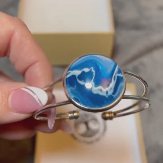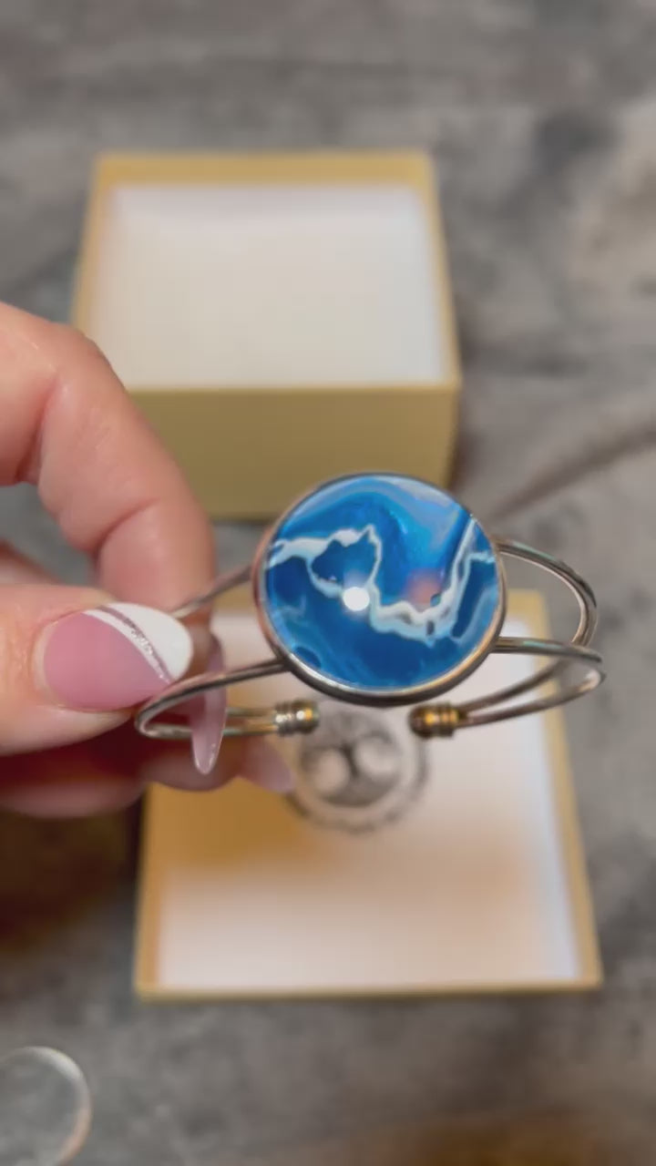 At the center rests a hand-poured fluid art cabochon in deep ocean blues and soft white waves—each pour completely unique, meaning no two bracelets will ever be the same. The adjustable bangle design allows for a comfortable, customized fit while maintaining a sleek, polished look.